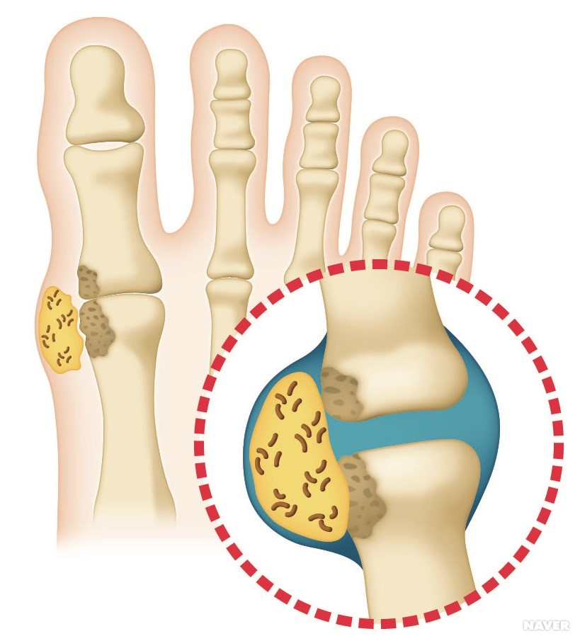 통풍은 '요산'이 배출되고도 남을 정도로 많아 관절이나 다른 조직에 결정 형태로 쌓여 발병합니다. 요산 결정이 관절을 둘러싼 활막에 염증을 일으키며 통증과 붓기가 시작됩니다.