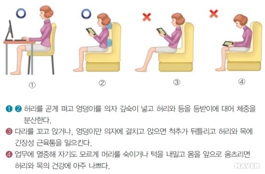 - 바르게 앉고 오래 앉아있지 않는다.