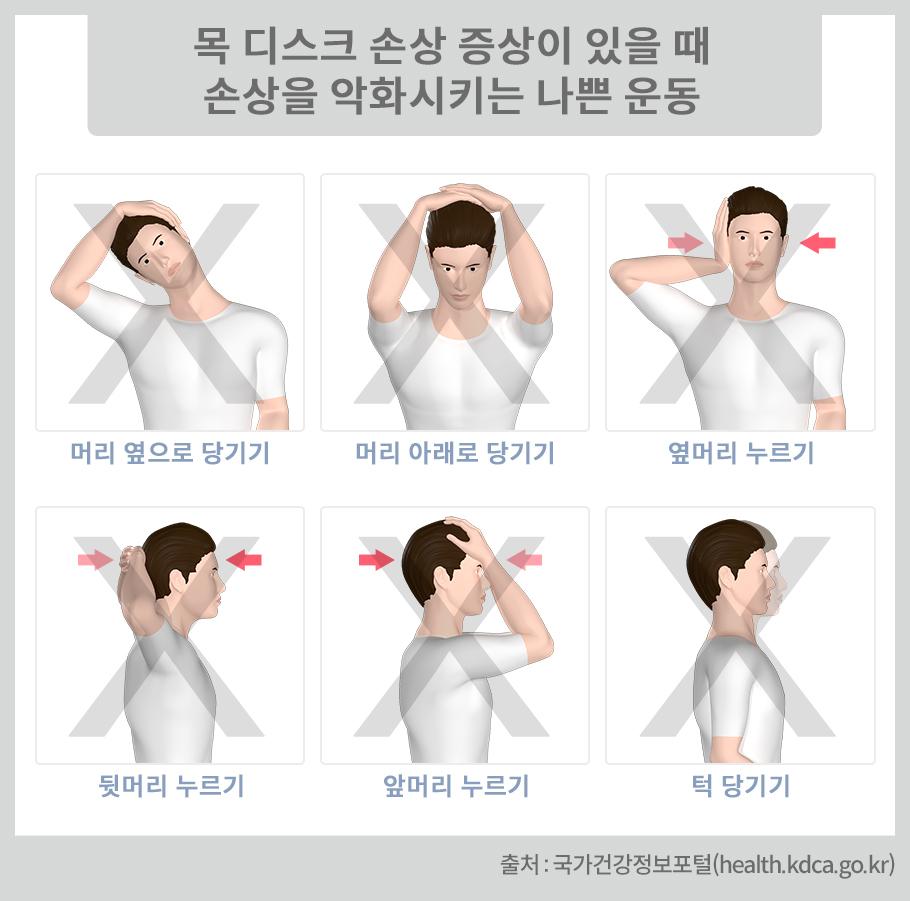 흔히 목이 아프다고 하면 PT샵이나 인터넷에서 위와 같은 자세로 근육을 풀어 주라고 하는 얘기를 많이 듣습니다. 하지만 이 자세는 정말 목 근육이 피로한 사람에게 효과가 있을 뿐 디스크 증상이 있는 분들에게는 매우 나쁜 자세라고 합니다.